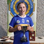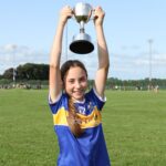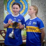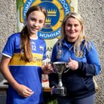 Chairperson Munster Camogie Christine Ryan presenting the Tipperary captain wit the U14 B final cup at the Munster U14 Blitz in Rathkeale