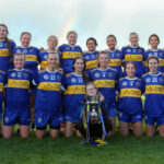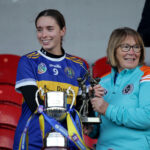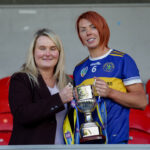 Chairperson Munster Camogie Christine Ryan presenting Patrickswell captain Sarah Carey with the Junior Cup at the AIB Munster Junior Final 2025