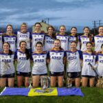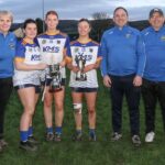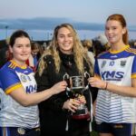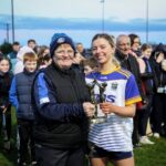 Sarah O’Connell Granddaughter of Mai O’Connell presenting Brian Borus joint captains Mary Barrett and Ava Caplice with the cup at the Junior A final in Ballyporeen on Sunday 7th December 2025