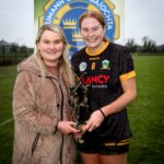 Niece of Mai O’Connell Sheia Ashe Presenting St Patricks captain No6 Emily Fox with the Junior C Mai O ‘Connell Tournament 2025 in Cappamore on Sunday 30th November 2025